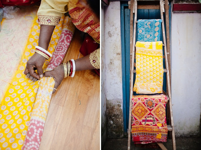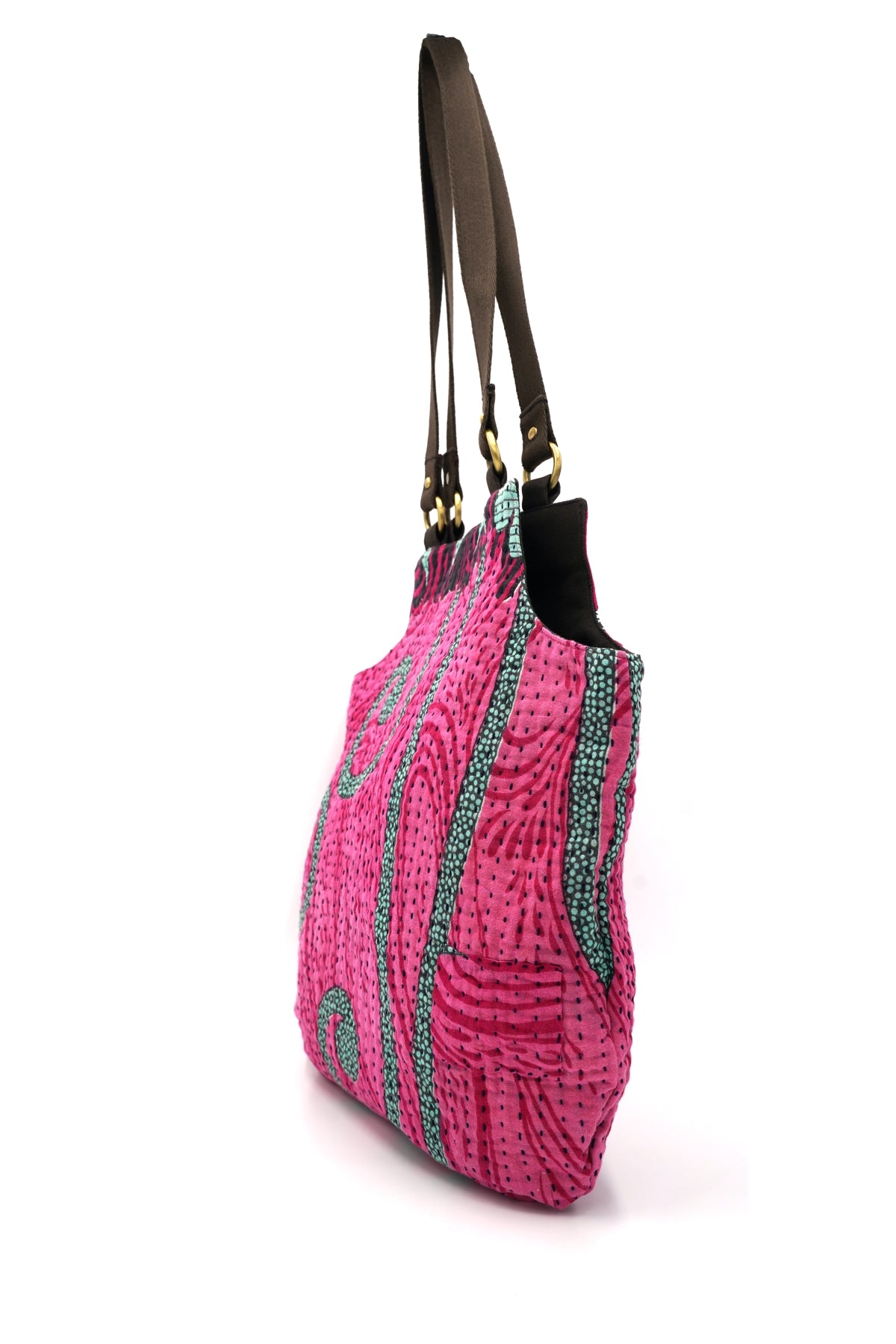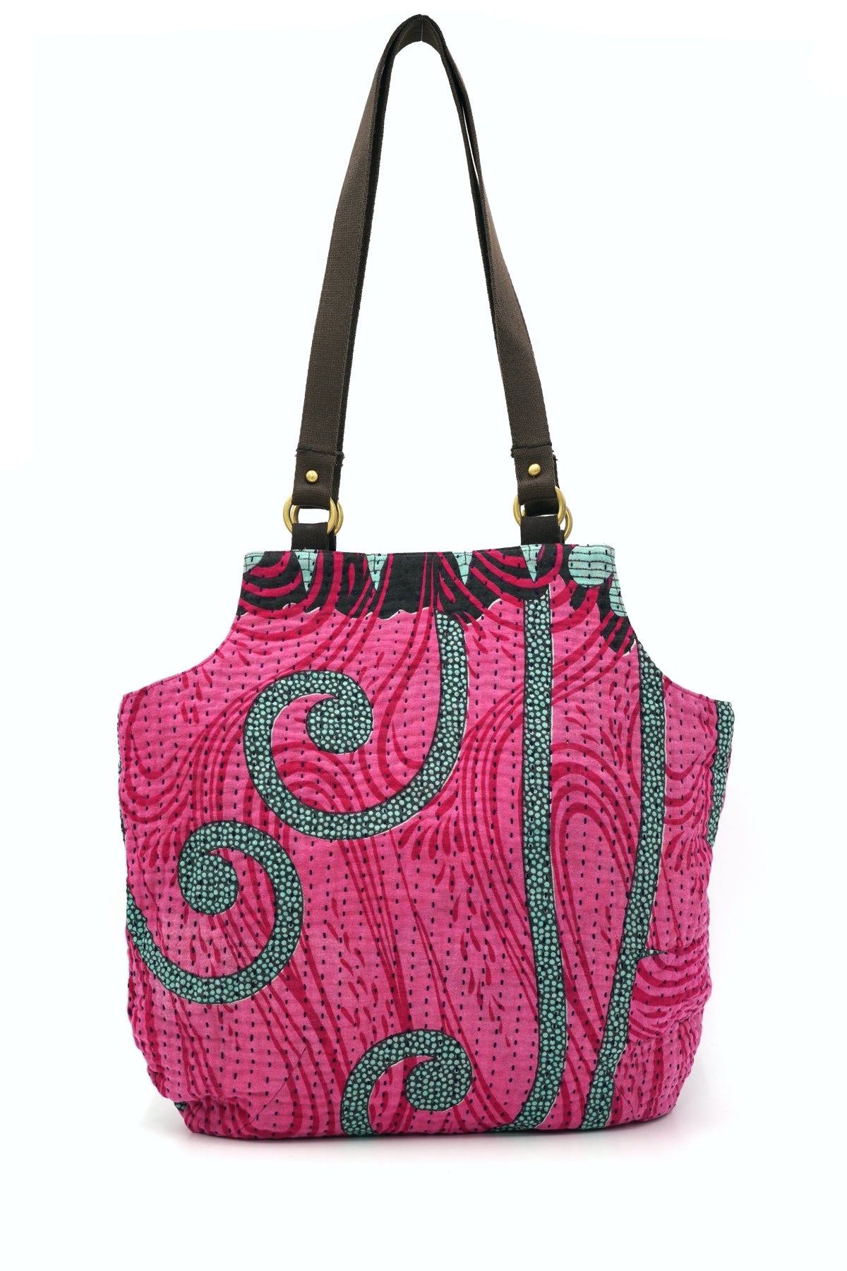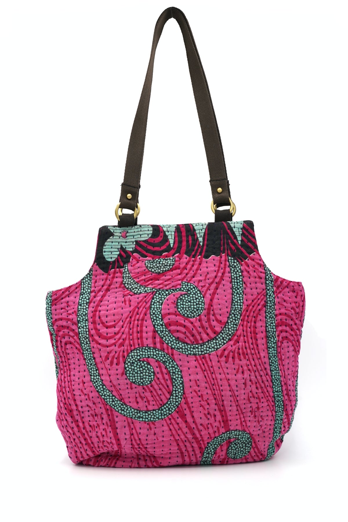 Diese SARI BARI-Tasche wurde in der traditionellen, bengalischen Kantha-Technik von einer Frau hergestellt, die vom Menschenhandel betroffen war. Die recycelten Saris werden im Kantha-Stil, von Hand genäht, mit einem Schildchen versehen, auf dem der Name der Heldin zu finden ist, die dieses Produkt mit so viel Liebe hergestellt hat.