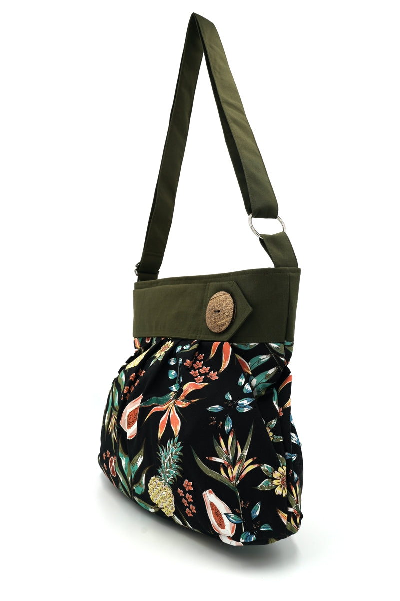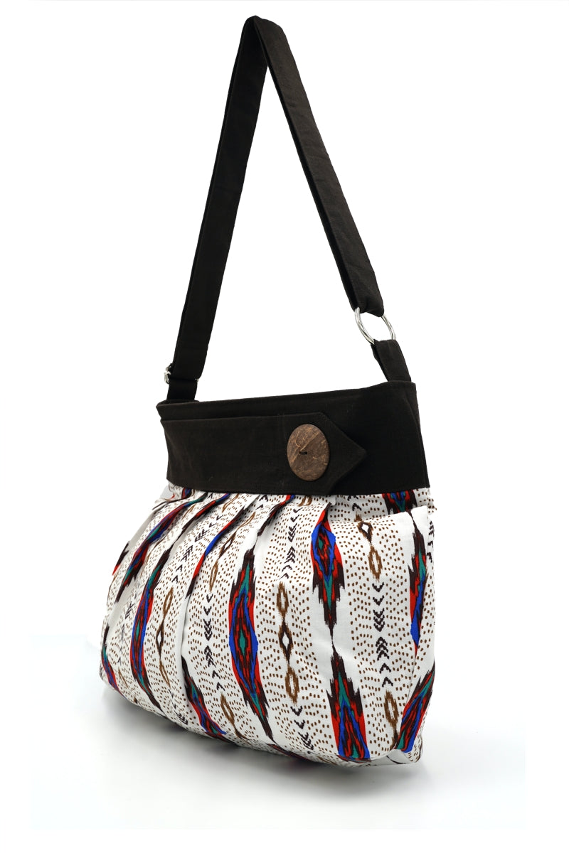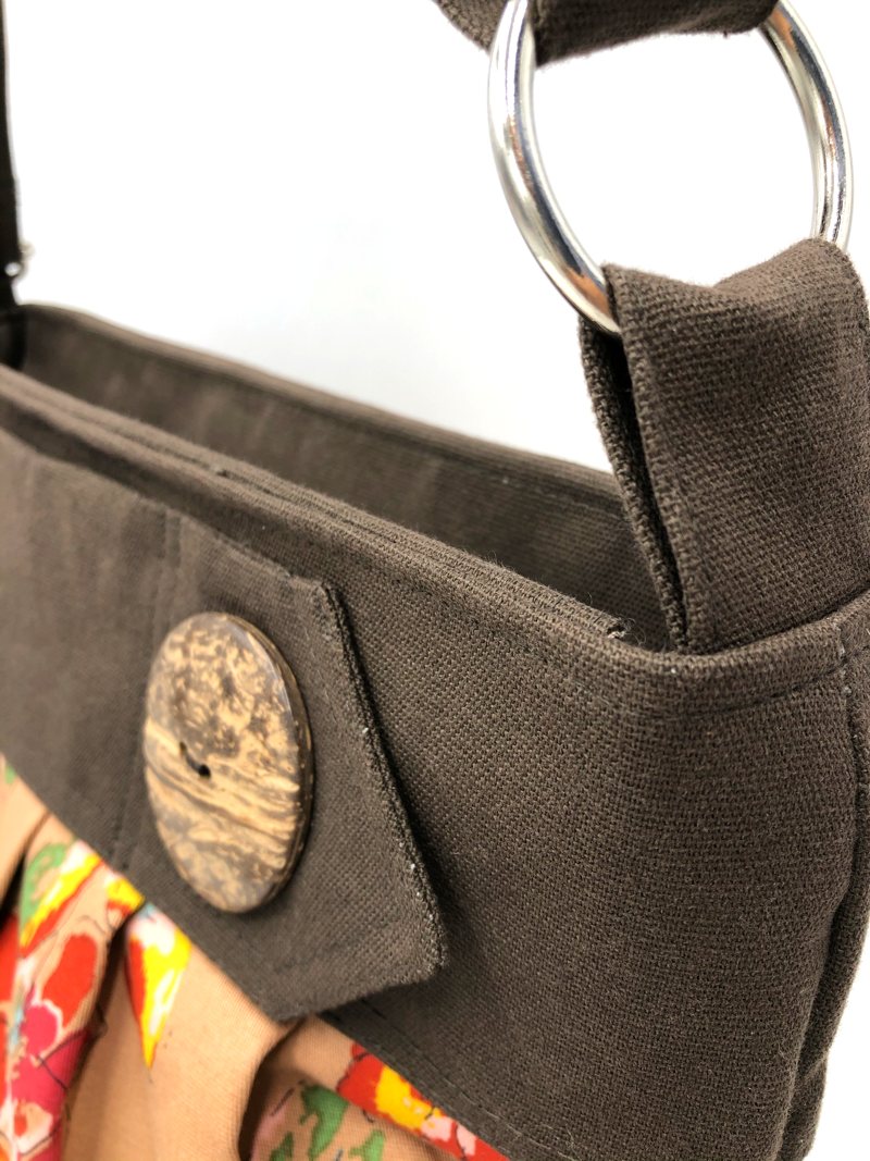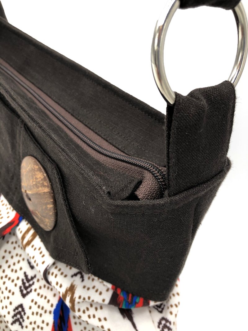 Em ist schick und zeitlos. Der Kokosnussknopf, ein landestypisches Material dort in Kambodscha, macht die Tasche besonders. Außerdem werden fast alle Kokosnussakzente von Herrn Bang hergestellt. Mit seiner Arbeit für Sak Saum kann er somit seine ganze Familie finanziell versorgen.