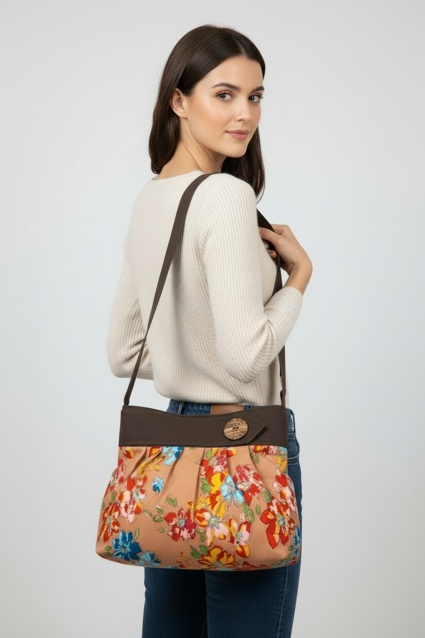 Em ist schick und zeitlos. Der Kokosnussknopf, ein landestypisches Material dort in Kambodscha, macht die Tasche besonders. Außerdem werden fast alle Kokosnussakzente von Herrn Bang hergestellt. Mit seiner Arbeit für Sak Saum kann er somit seine ganze Familie finanziell versorgen.